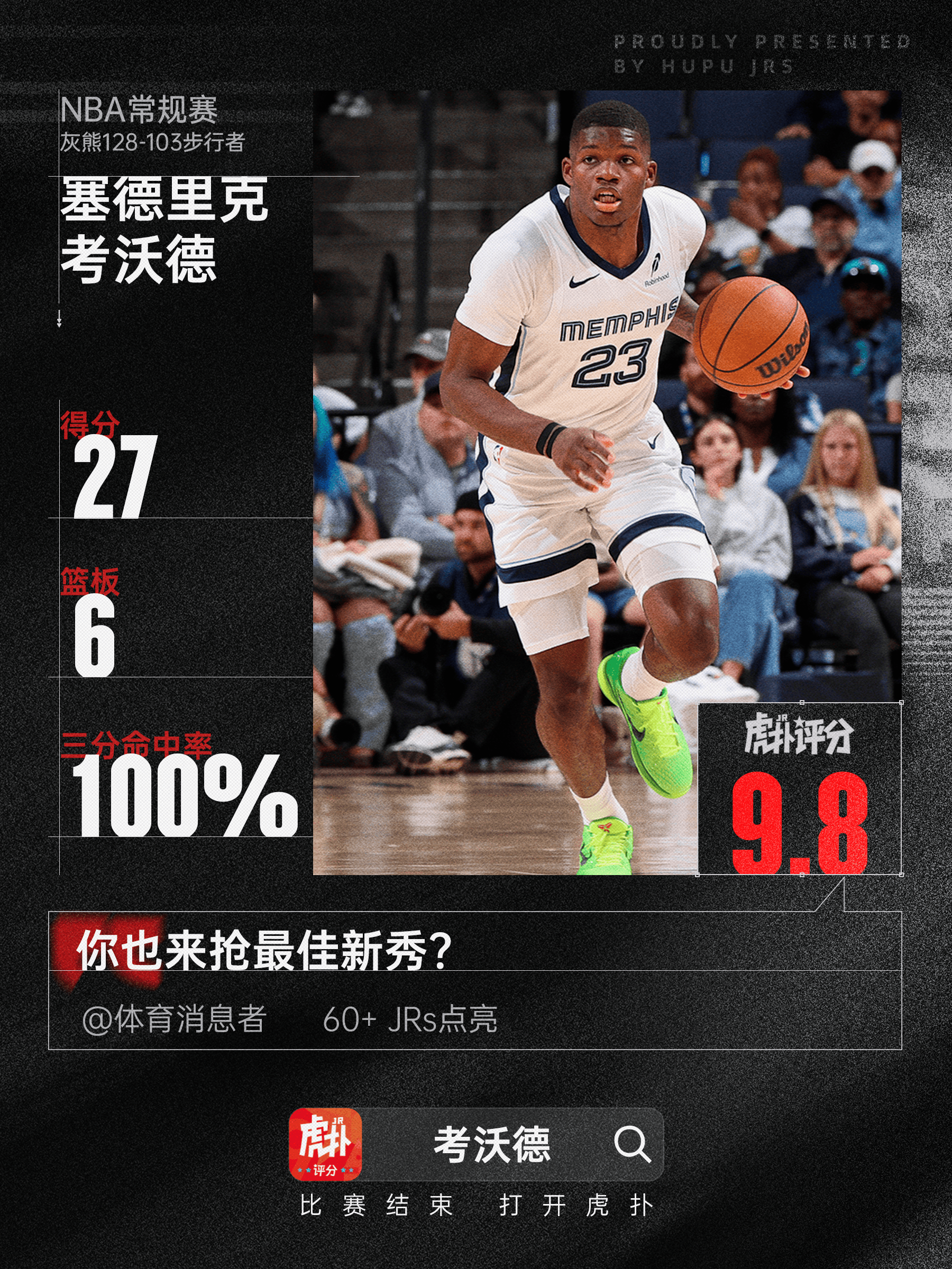 虎撲10月26日訊 今天NBA常規(guī)賽灰熊主場(chǎng)對(duì)陣步行者的比賽已經(jīng)結(jié)束。全場(chǎng)戰(zhàn)罷,德全灰熊以128-103戰(zhàn)勝步行者。場(chǎng)出