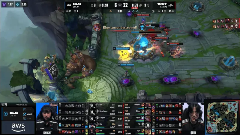 比賽第22分鐘,兩隊(duì)爆發(fā)厄塔汗團(tuán)。Quid阿蘿拉三殺幫助100T打出2換5團(tuán)滅BLG。