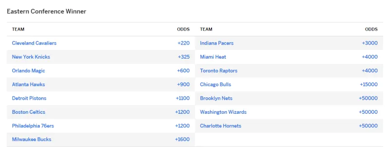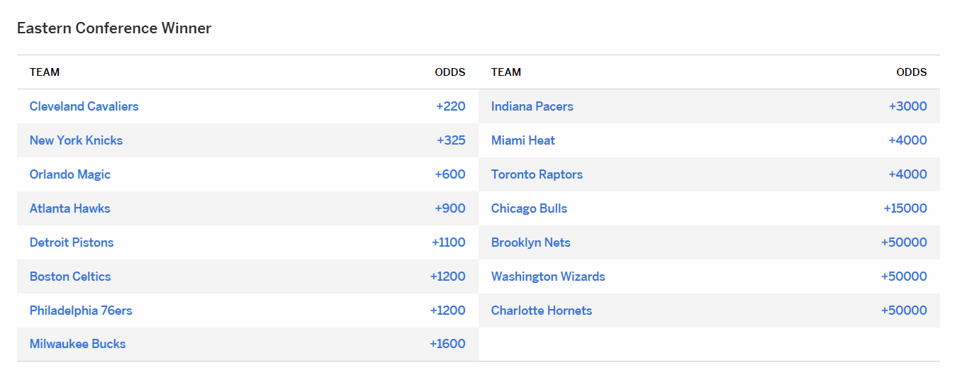 賽季開始前,冠軍ESPN更新了新賽季東部冠軍的賠率賠率,具體如下: