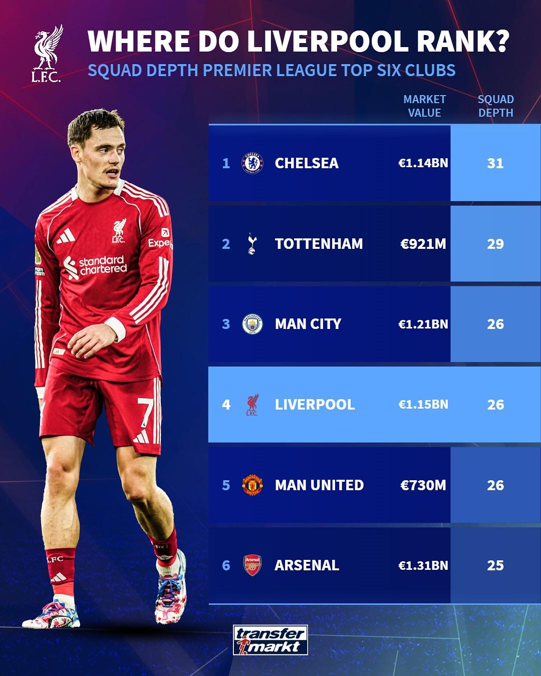 虎撲10月30日訊 德國(guó)轉(zhuǎn)會(huì)市場(chǎng)統(tǒng)計(jì)了英超BIG6球隊(duì)本賽季的陣容深度情況: