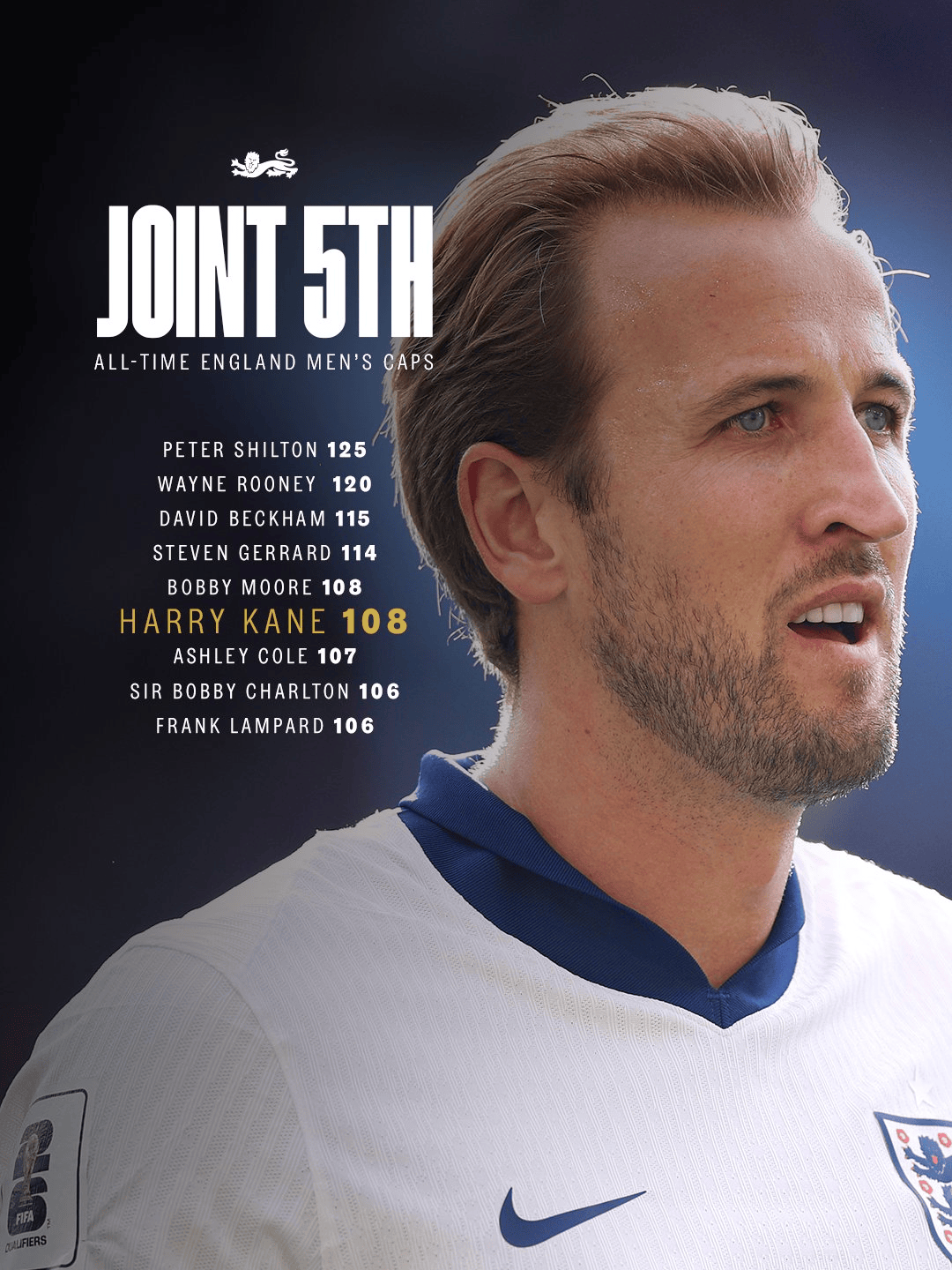 虎撲09月07日訊 在英格蘭2-0戰(zhàn)勝安道爾的比賽中,凱恩首發(fā)登場(chǎng),恩國(guó)這也是家隊(duì)他代表英格蘭隊(duì)的第108次出場(chǎng),追平博比-摩爾,出場(chǎng)并列隊(duì)史第5。數(shù)并史第