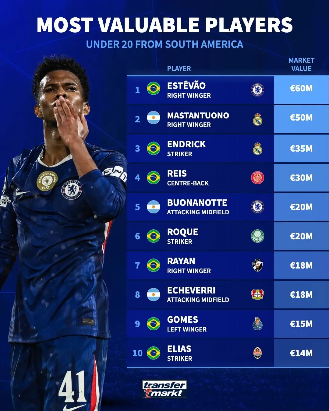 虎撲10月30日訊 德國(guó)轉(zhuǎn)會(huì)市場(chǎng)統(tǒng)計(jì)了目前年齡在20歲以下的南美球員身價(jià),詳情如下: