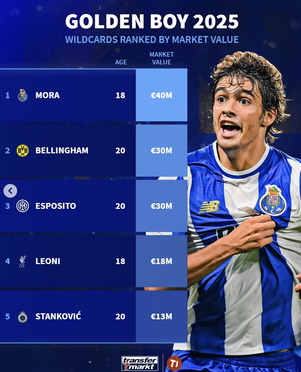 外卡1. 羅德里戈-莫拉(18歲):波爾圖,4000萬