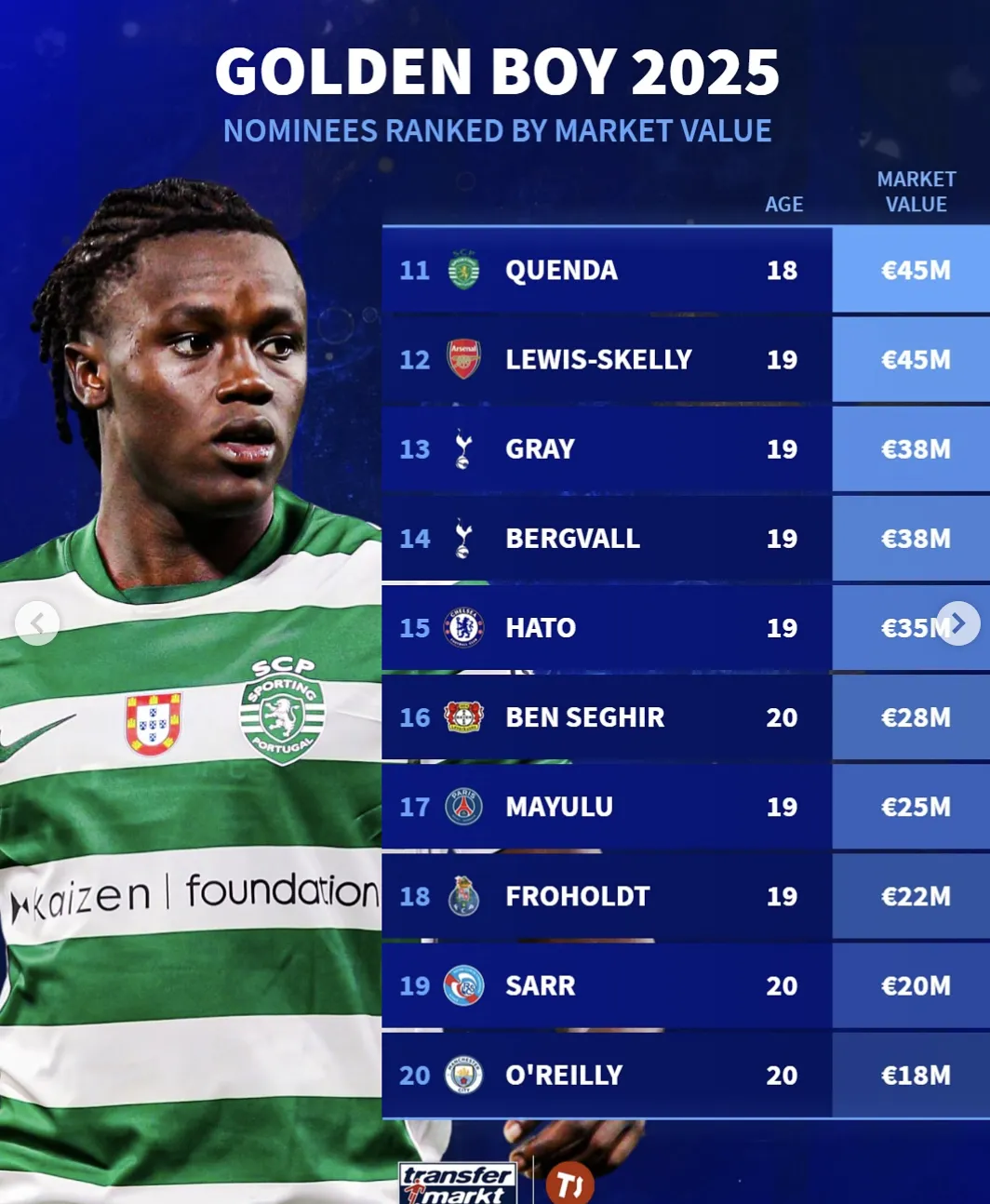 11. 昆達(dá)(18歲):葡萄牙體育,4500萬