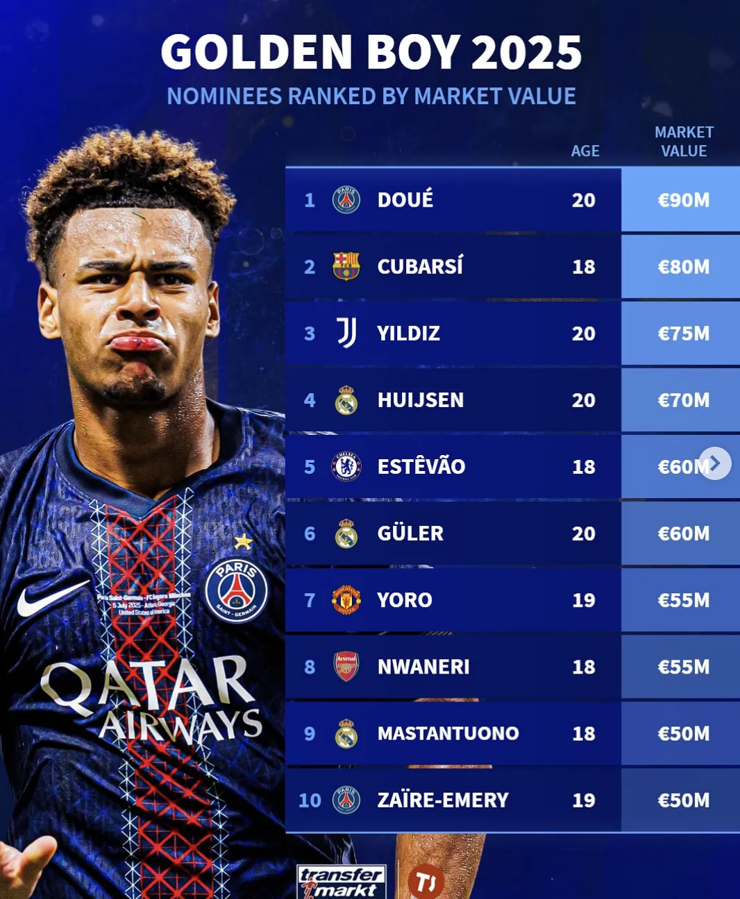 巴黎圣日爾曼的杜埃以9000萬居首,巴薩的庫巴西和尤文的伊爾迪茲分別以8000萬和7500萬分居二三位。