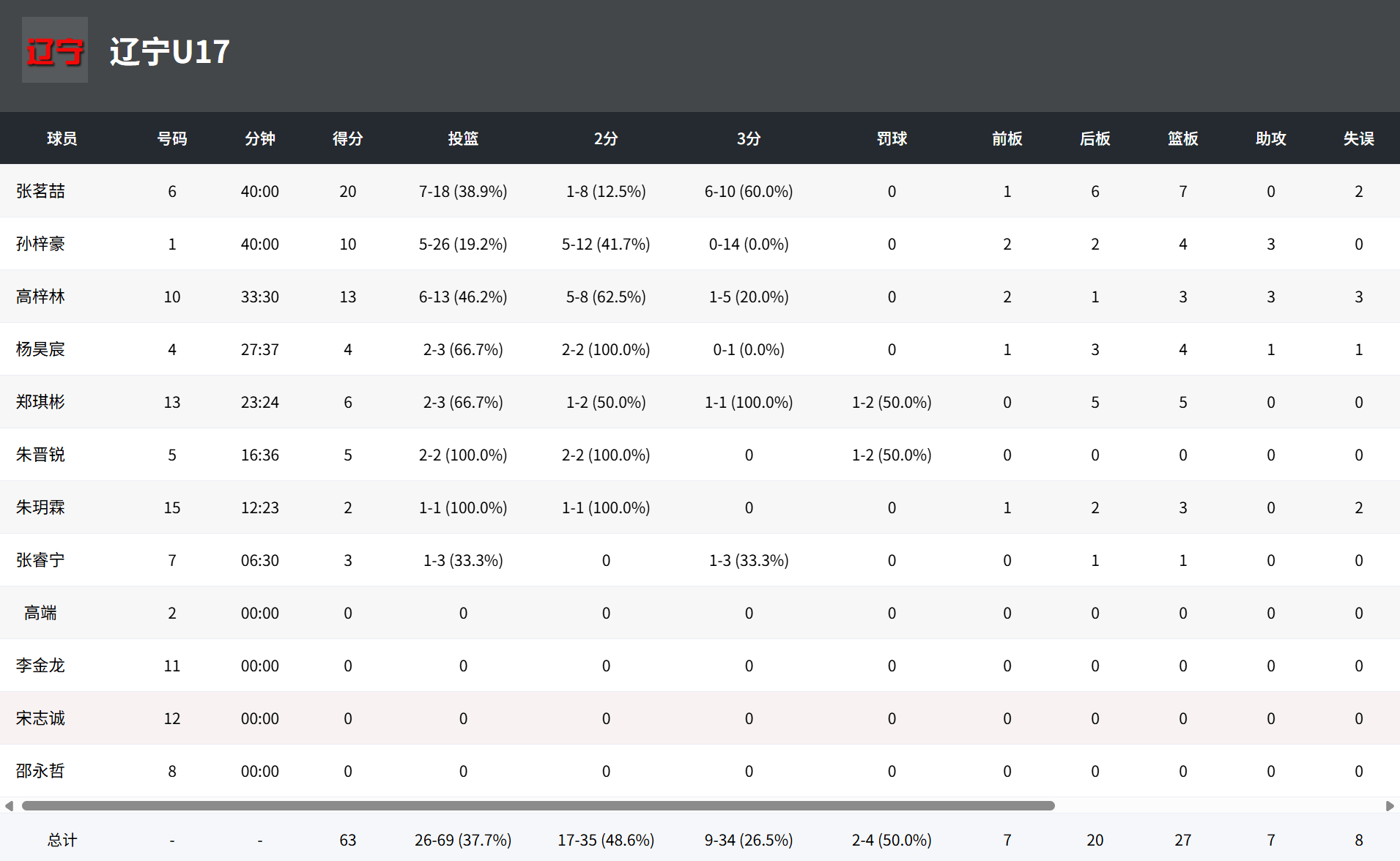 遼寧U17男籃:張茗喆20分7籃板、文分高梓林13分、陽(yáng)中孫梓豪10分