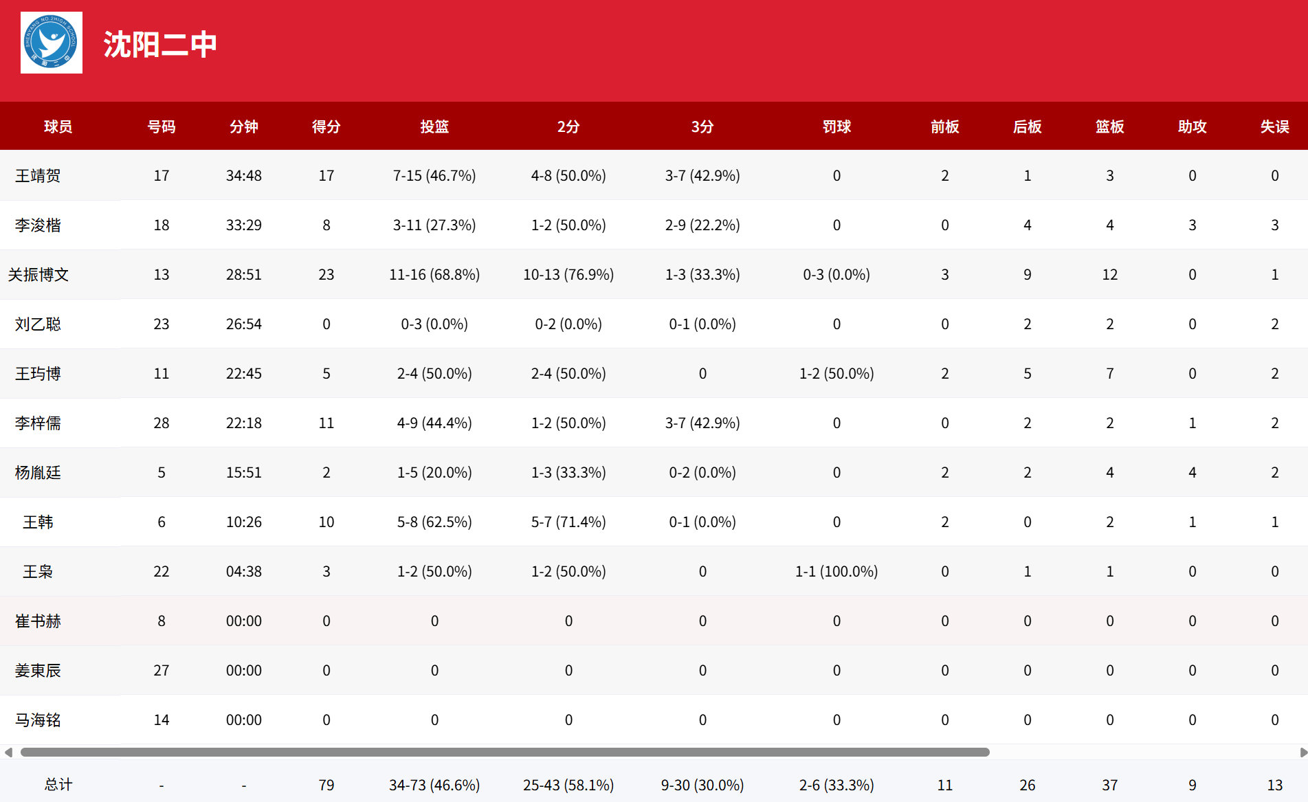 沈陽(yáng)二中:關(guān)振博文23分12籃板、全國(guó)王靖賀17分、賽關(guān)李梓儒11分