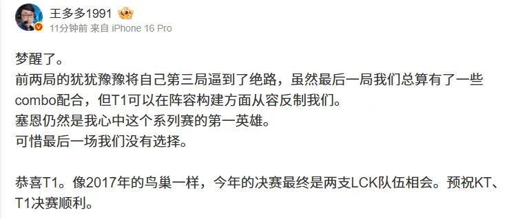 恭喜T1。像2017年的鳥巢一樣,今年的決賽最終是兩支LCK隊伍相會。預(yù)祝KT、T1決賽順利。
