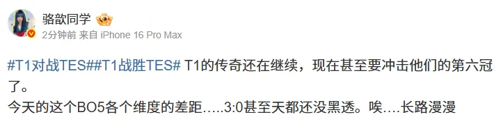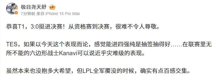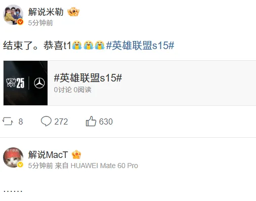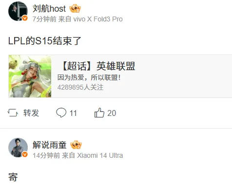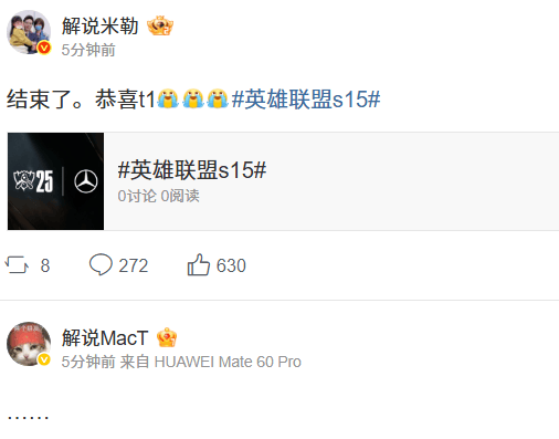 虎撲11月02日訊 S15淘汰賽,TES 0-3 T1。賽后LPL官方解說主持發(fā)文。