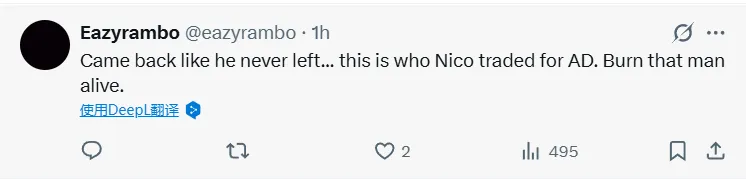 -回歸得像從未離開過……這就是尼科為安東尼·戴維斯交易來的人。把那個人活活燒了。