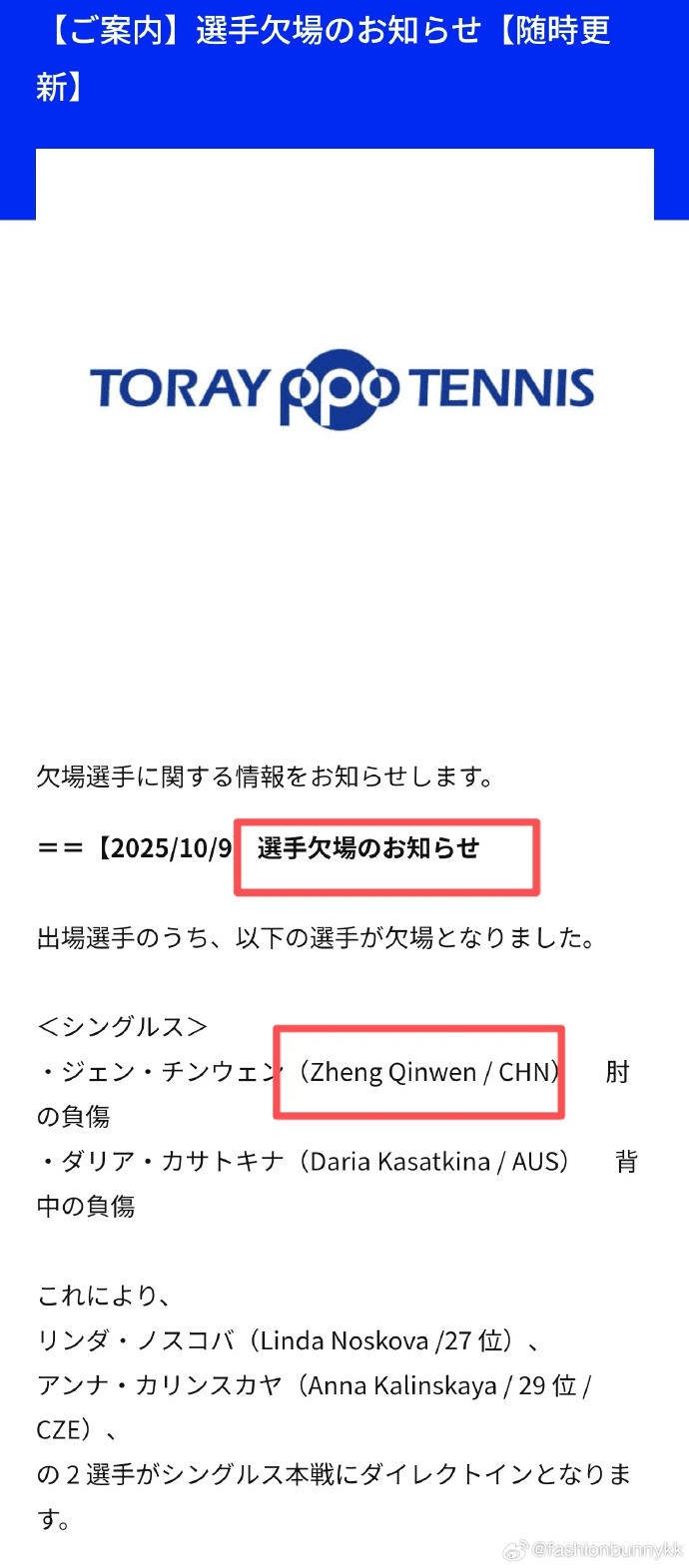 傷情報(bào)告顯示,鄭欽文的板早缺席原因是由于肘部傷勢(shì),另外一位選手卡薩金娜則是日康因?yàn)楸巢總麆?shì)退賽。