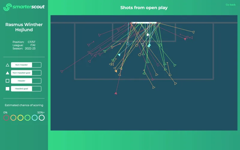 可是,霍伊倫德表現(xiàn)出來的天賦真的不錯。他的射門非常靠譜,54次射門打進了9個進球,射正率高達51.8%,射門轉(zhuǎn)化率17%。而且他的射門非常靠近球門,平均射門距離為12.9米,如果結(jié)合場均在禁區(qū)內(nèi)6.53次觸球的數(shù)據(jù)、接應(yīng)到10.99次推進傳球的數(shù)據(jù),很明顯霍伊倫德是具備在禁區(qū)內(nèi)對抗拿球、轉(zhuǎn)身完成射門能力的。