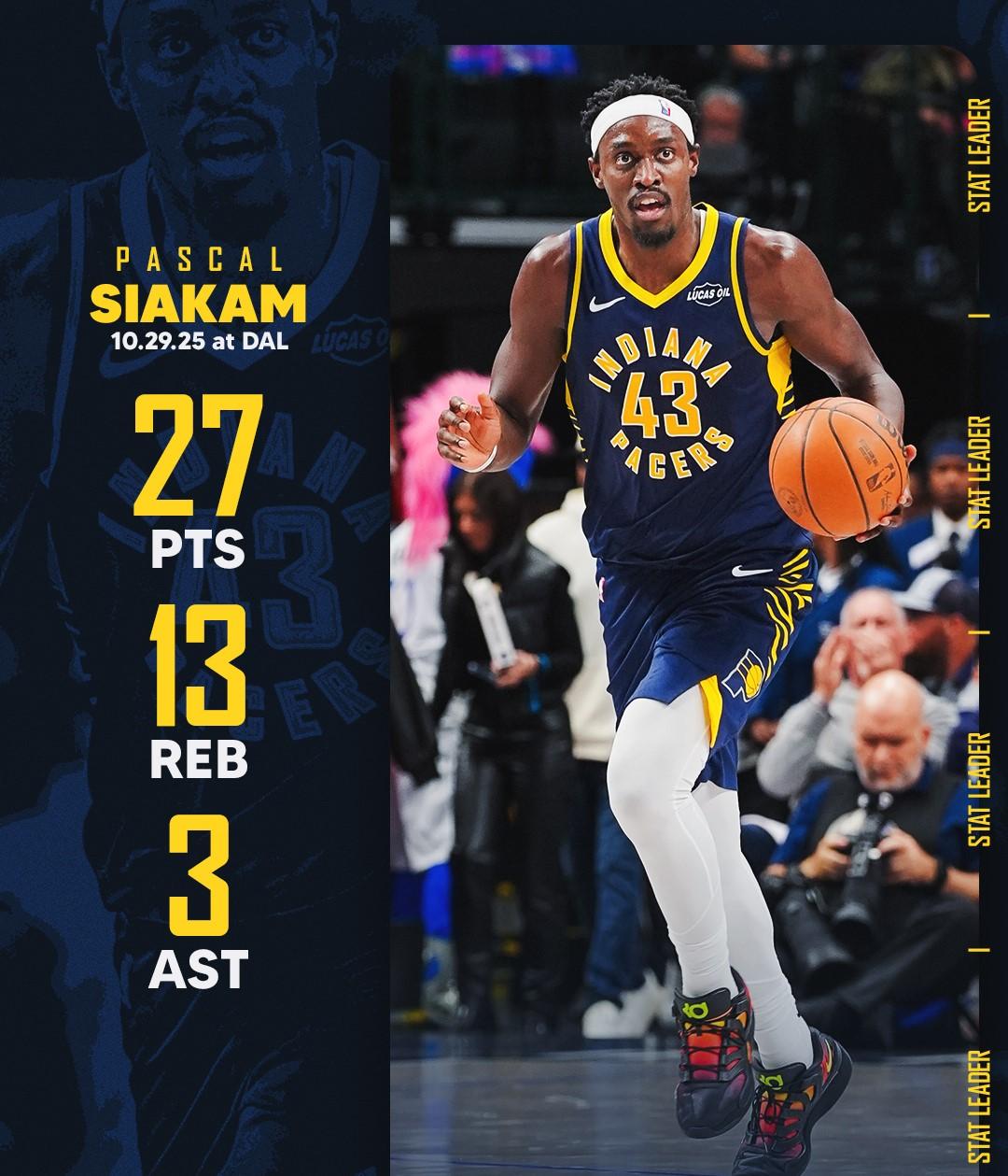 步行者官方社媒分享西亞卡姆數(shù)據(jù)海報,并寫道:西亞卡姆今晚在達拉斯再次拿下兩雙。