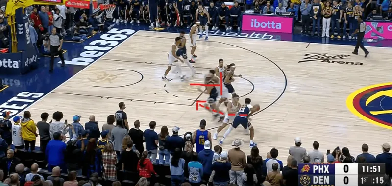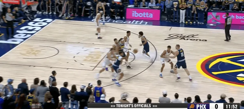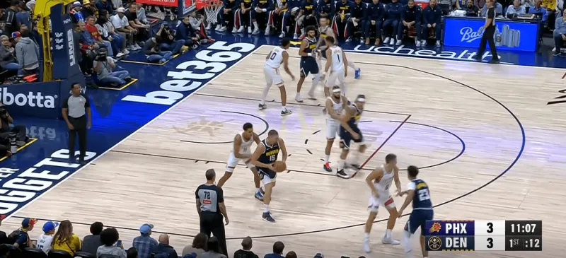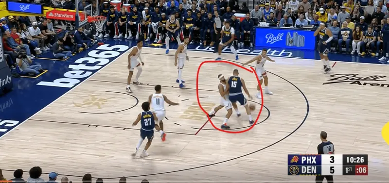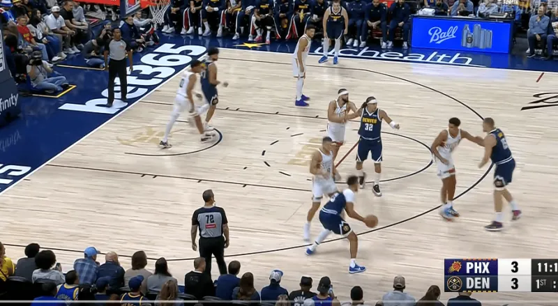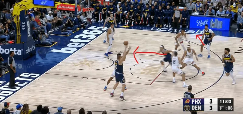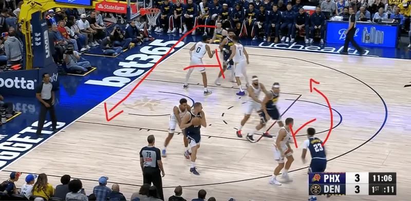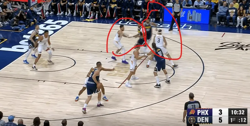 在被掘金連續(xù)用同一戰(zhàn)術打成功后,太陽增加了防守端的投入,也就是換防更加及時。