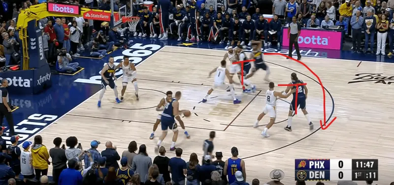 戰(zhàn)術起手式是約翰遜在左側45度持球,約基奇在弧頂,戈登在罰球線,布勞恩落右側底角,穆雷落在籃下。