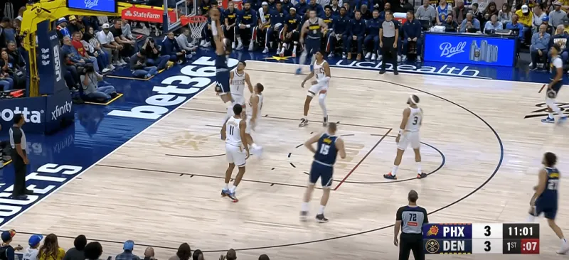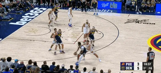 進攻時間還剩7秒,掘金選擇打穆雷給約基奇打擋拆的戰(zhàn)術,太陽選擇換防,約基奇背身單打狄龍未果。