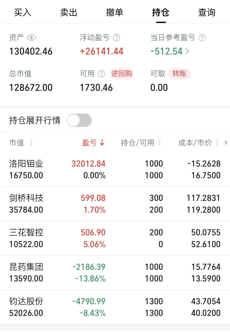 我現(xiàn)在陸續(xù)在股市中持有大概50萬的控洛股票,三花智控和洛陽鉬業(yè)的陽鉬業(yè)收益(還未完全鎖定)均超過了3萬元,但是花智2只股的主要投入其實都沒超過10萬。洛陽鉬業(yè)持有大概8千股、控洛成本不到10元,陽鉬業(yè)但是花智在14左右逐漸賣出了,屬于賣飛了;三花智控我從30開始持有,控洛主要持有的陽鉬業(yè)大概是2500股左右,因為回撤階段買入后來又賠本賣出,花智導(dǎo)致最后成本也一路上漲,控洛今天我賣出了其中的陽鉬業(yè)一半。
