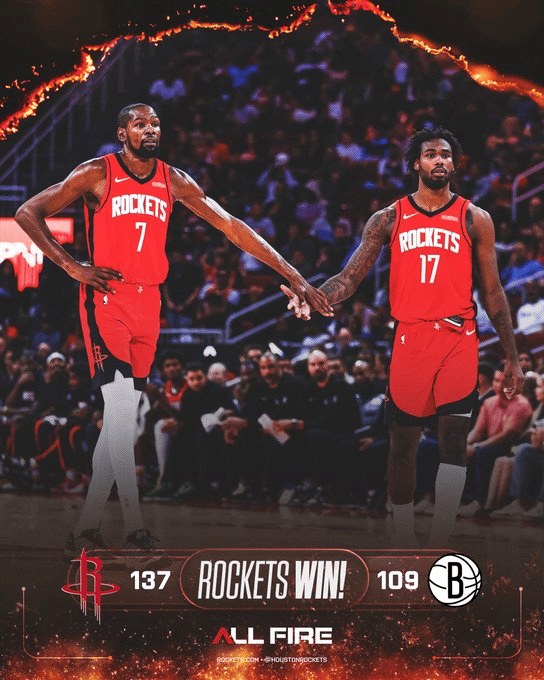 賽后,火箭官方曬出贏球海報:杜蘭特、伊森登上封面。
