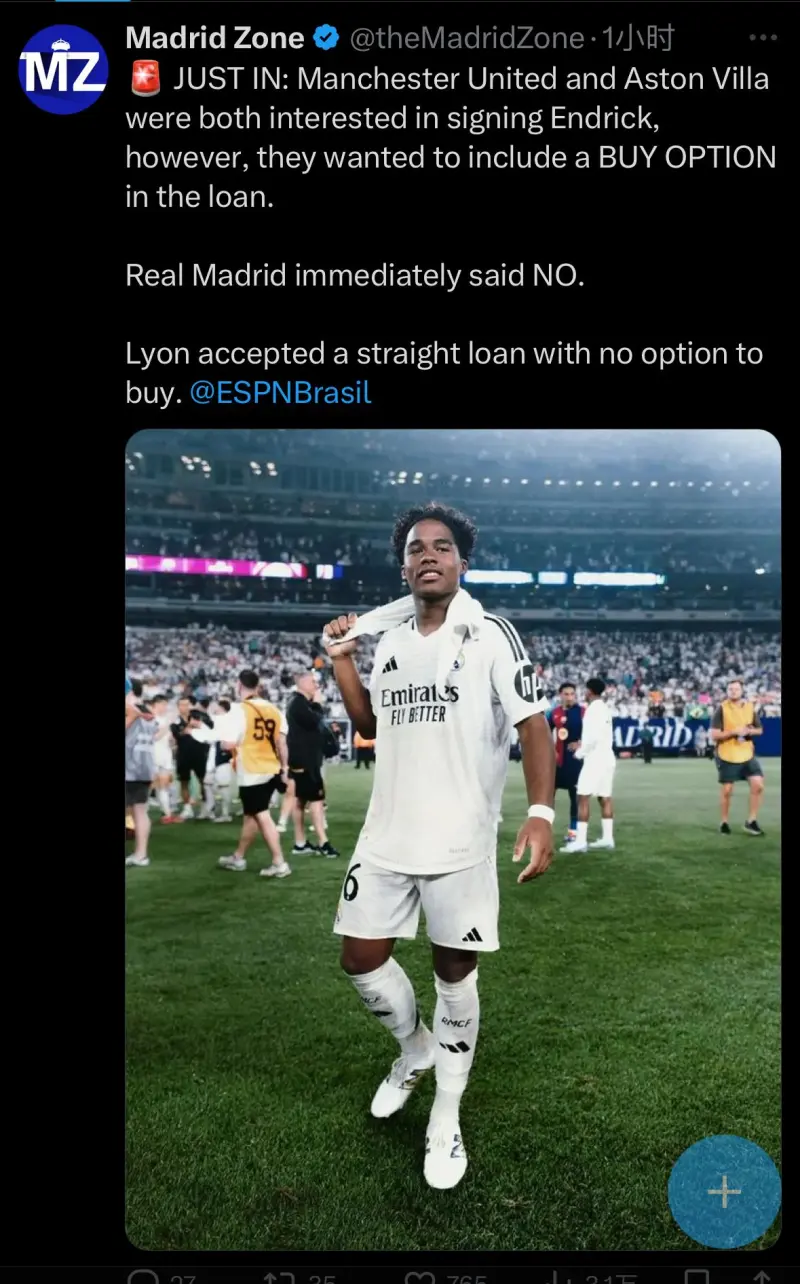 巴西ESPN:曼聯(lián)和阿斯頓維拉都有意簽下皇馬球員恩德里克,但他們希望在租借合同中加入買斷選項(xiàng)。皇家馬德里立刻拒絕了。里昂則接受了一筆純粹租借、不含買斷條款的交易。