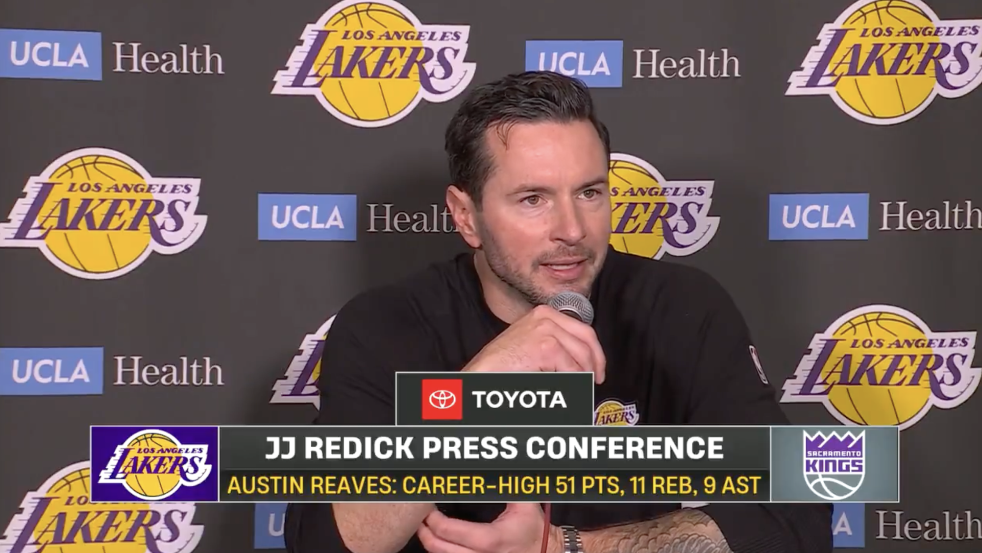 賽后湖人主帥JJ-雷迪克在接受采訪時談到了奧斯汀-里夫斯。雷迪克表示:“他堅持不懈地比賽。他每天都在健身房,這一點顯而易見,他熱愛比賽,在比賽中不斷成長。”